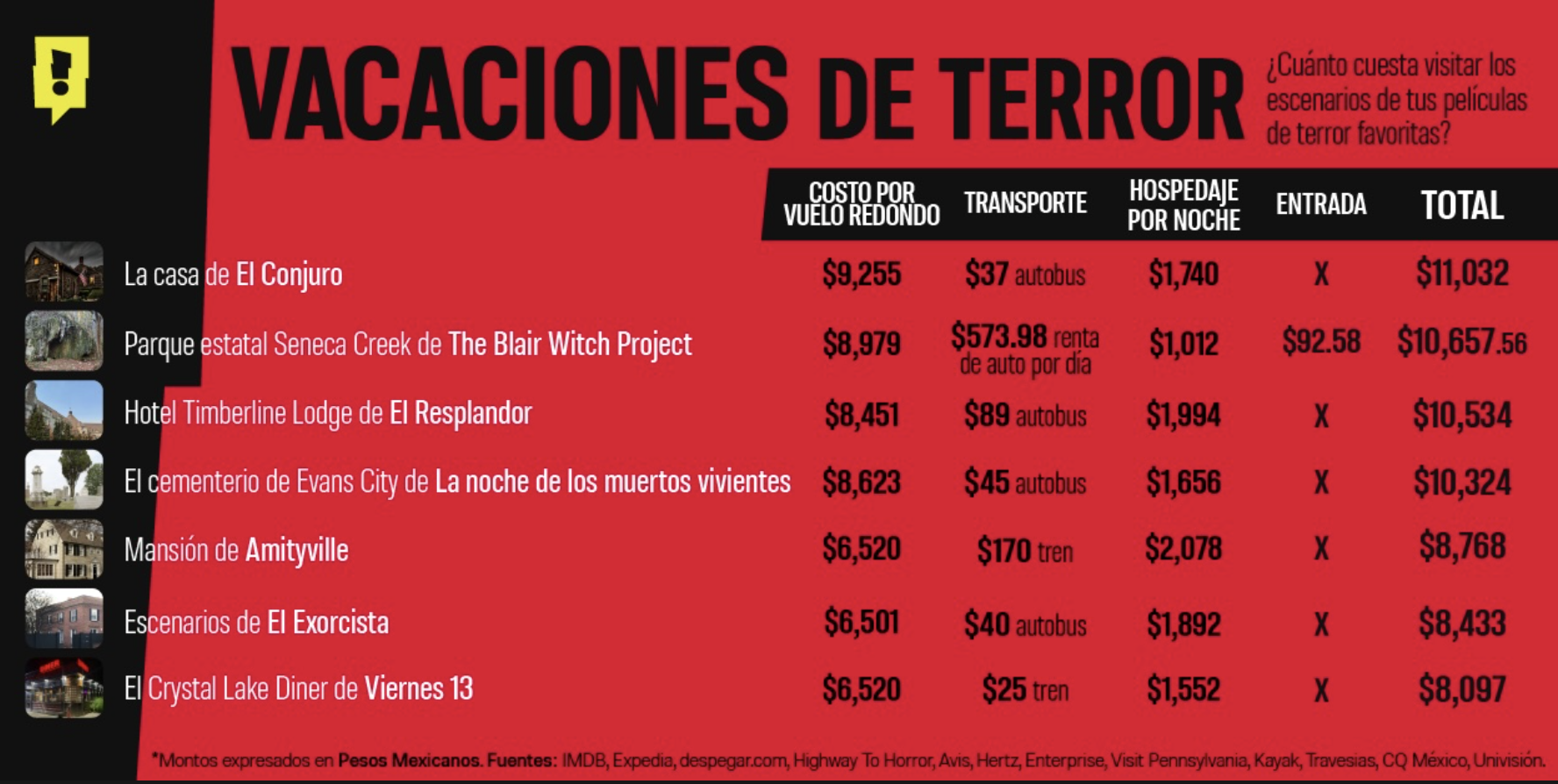 Spoiler realizó un conteo de cuáles son los sets salidos de los filmes de terror más emblemáticos del género que existen en la vida real y cuánto tendrían que invertir los viajeros para aventurarse en esta excursión.