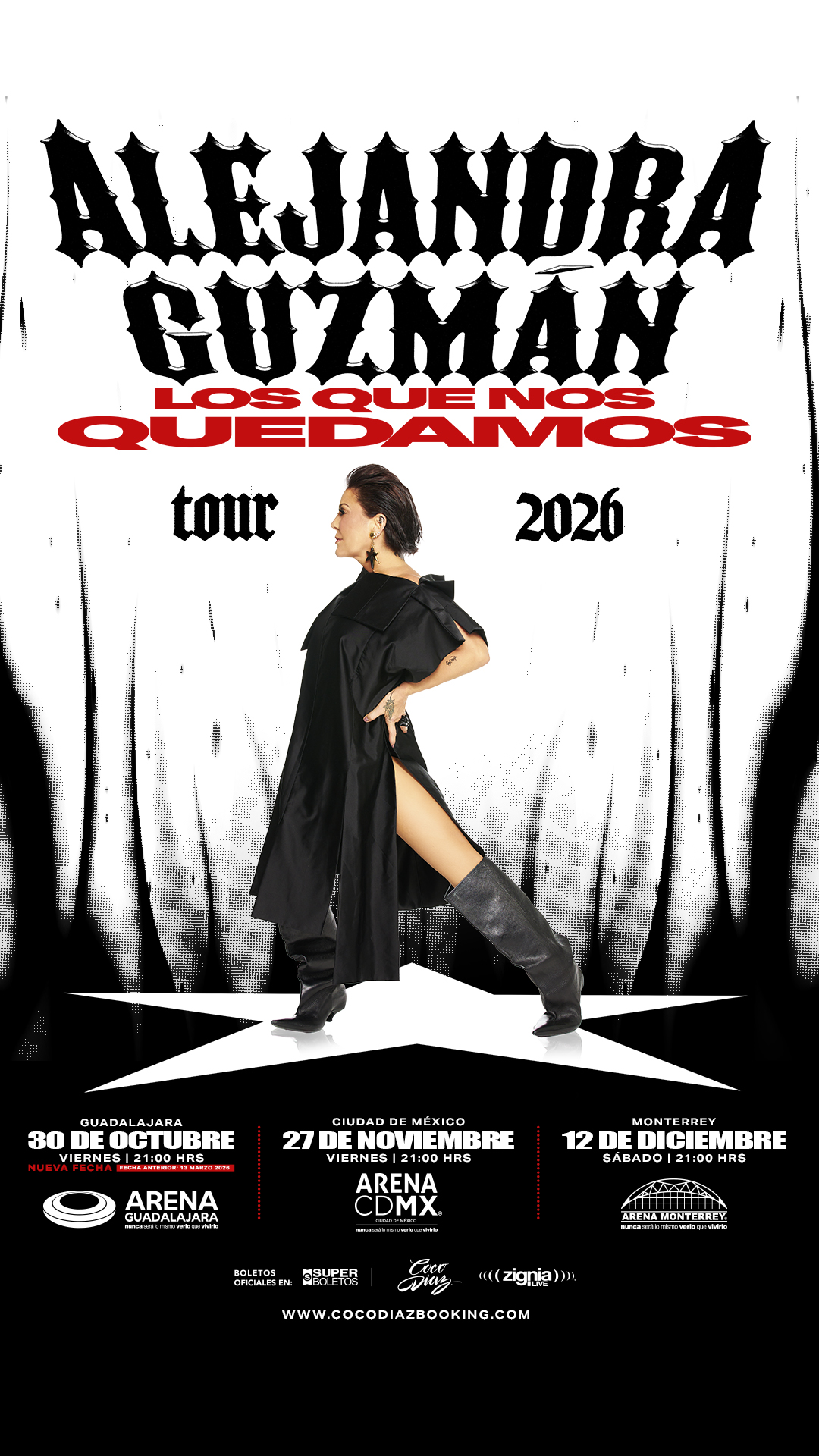Como parte de esta nueva gira, Alejandra Guzmán llegará a la Arena Guadalajara el próximo 30 de octubre, fecha que sustituye a la originalmente programada para el 13 de marzo y cuyos boletos continúan siendo válidos. Asimismo, la artista se presentará en la Arena CDMX el 27 de noviembre y en la Arena Monterrey el 12 de diciembre.