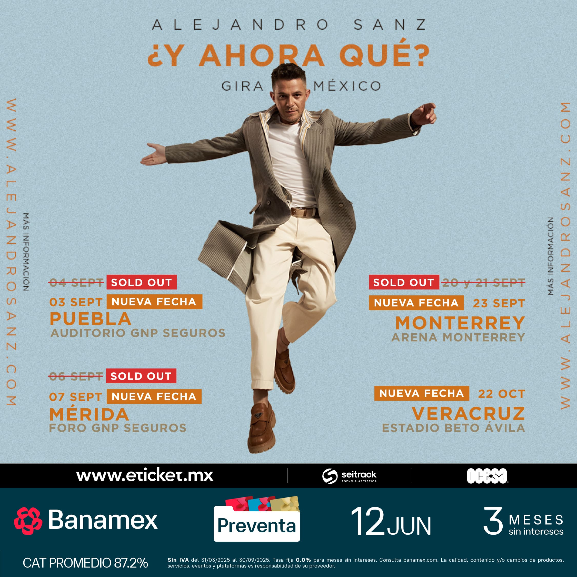 ¿Y Ahora Qué? es el nombre con el que Alejandro Sanz bautizó su nueva gira, un desafío artístico que promete un espectáculo inolvidable. Ante la abrumadora respuesta del público, el tour sumó más fechas en varias ciudades de la República Mexicana.