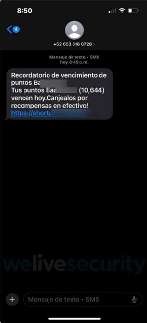 El modus operandi inicia con un SMS de tipo recordatorio que sugiere el canje de puntos o recompensas “solo por hoy”, buscando generar un sentido de urgencia en la víctima.