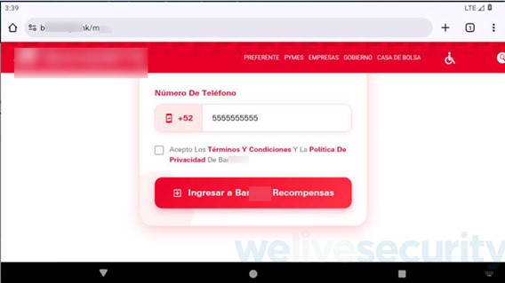 Una vez superado el captcha, aparece una plantilla idéntica la oficial del banco para no levantar sospechas, además de un formulario donde se le solicita a la víctima un número de teléfono y que acepte los “Términos y condiciones” junto con la “Política de Privacidad” para poder canjear la recompensa en efectivo.