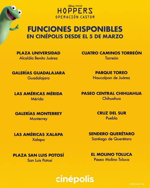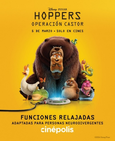 Adicionalmente, HOPPERS: OPERACIÓN CASTOR contará con funciones relajadas, una iniciativa de Fundación Cinépolis en alianza con Iluminemos por el Autismo, que ofrece una experiencia cinematográfica incluyente para personas neurodivergentes, con estímulos visuales y sonoros reducidos, y la posibilidad de moverse libremente dentro de la sala.
