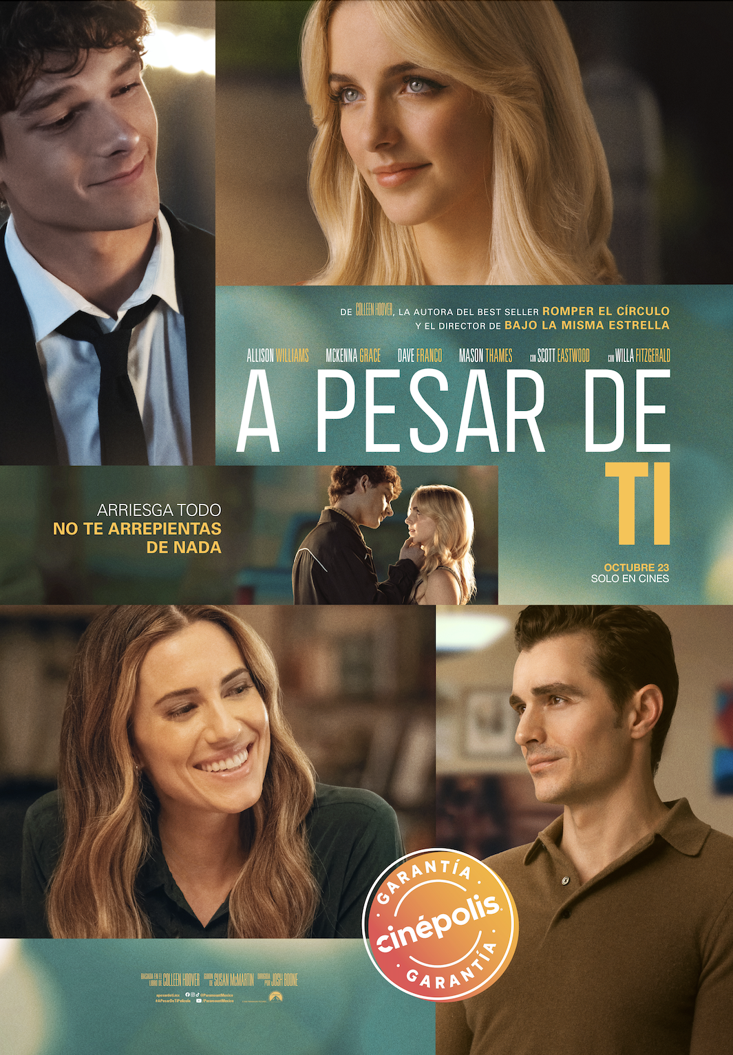 asada en el bestseller, A PESAR DE TI presenta al público a Morgan Grant (Allison Williams) y a su hija Clara (Mckenna Grace) mientras exploran lo que queda atrás tras un devastador accidente que revela una traición impactante y las obliga a confrontar secretos familiares, redefinir el amor y redescubrirse mutuamente. A PESAR DE TI es una historia de crecimiento, resiliencia y autodescubrimiento tras una tragedia, protagonizada además por Dave Franco y Mason Thames, junto a Scott Eastwood y Willa Fitzgerald, en cines este 23 de octubre.