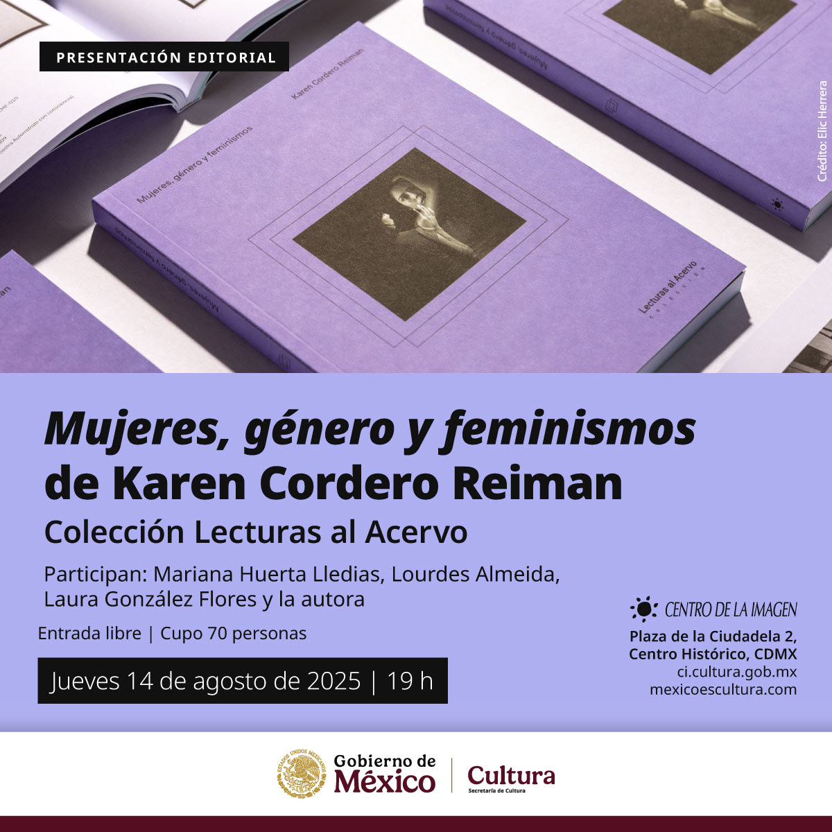 El Centro de la Imagen (CI), institución de la Secretaría de Cultura del Gobierno de México, presenta el libro “Mujeres, género y feminismos” de Karen Cordero Reiman, segundo volumen de la colección Lecturas al Acervo, que contará con la participación de Mariana Huerta Lledias, Lourdes Almeida, Laura González Flores y la autora, el jueves 14 de agosto a las 19 h, entrada libre.