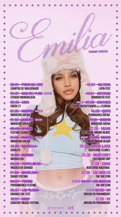 Este año, EMILIA ya ha ofrecido presentaciones destacadas en toda América Latina, incluyendo un concierto agotado para 30 mil fans en Mar del Plata, Argentina. Ahora se prepara para cerrar la gira, promovida por Live Nation, con dos shows muy esperados y agotados en Estados Unidos, primero enThe Wiltern en Los Ángeles, seguido de una presentación para cerrar la gira el 7 de septiembre en elBrooklyn Paramount en Nueva York.