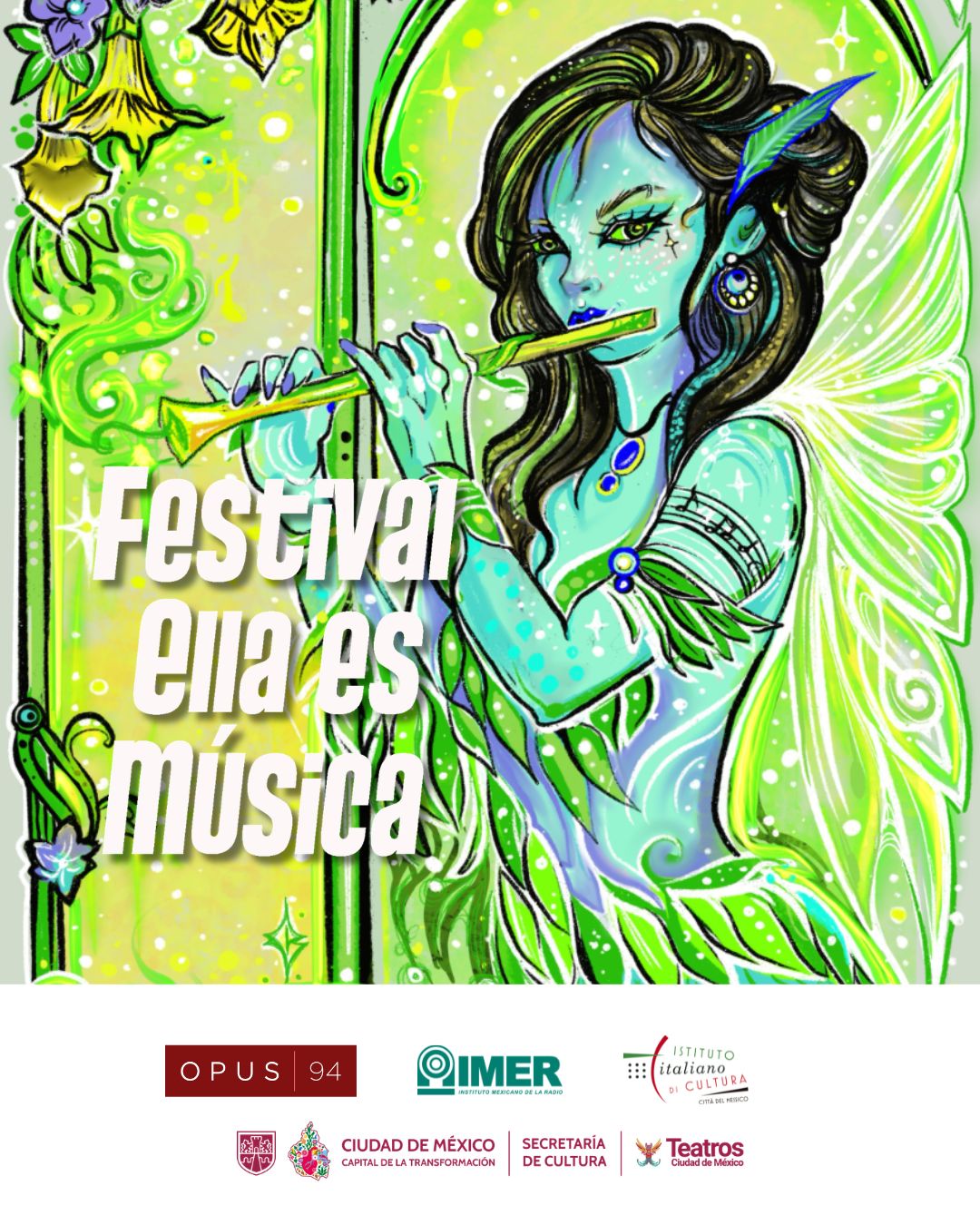 El arte del festival estuvo a cargo de la ilustradora Gabriela Kai y nos presenta a una ninfa poderosa con el don del encantamiento a través de su flauta.