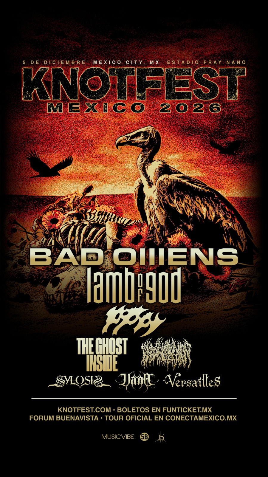 Encabezando el cartel se encuentran Bad Omens, una de las bandas más influyentes del metal moderno que ha conquistado a una nueva generación de fans alrededor del mundo, quienes llegarán con un show exclusivo, siendo su única presentación en Latinoamérica dentro de KNOTFEST México 2026, junto a los titanes del groove metal Lamb of God, quienes regresan con su característico sonido contundente y una trayectoria que los ha convertido en referentes del género.