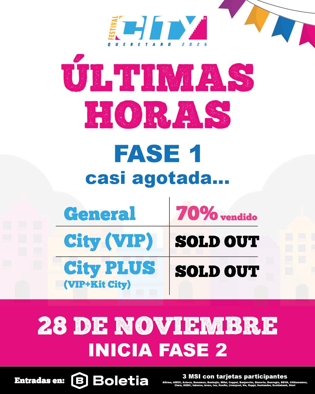 El Festival City continúa avanzando rumbo a su esperada edición 2026, y con ello, la Venta General – Fase 1 entra en su recta final. La organización ha alertado que esta etapa está a punto de agotarse, marcando el cierre de una de las primeras oportunidades para adquirir accesos a precio preferencial.