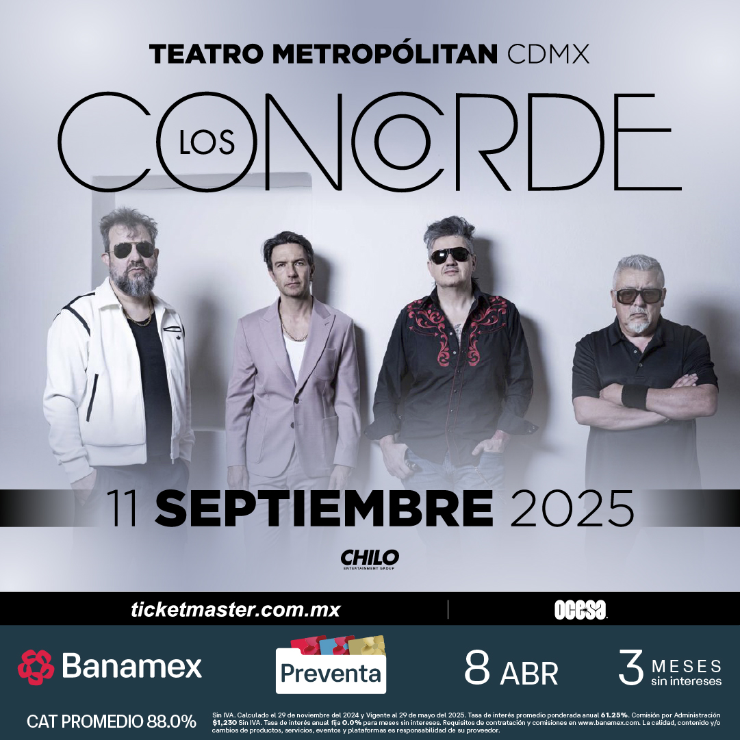 Los Concorde hicieron una pausa, pero su regreso está más fresco que nunca, para el próximo 11 de septiembre en el Teatro Metropólitan. Adquiere tus boletos en Preventa Banamex desde el 8 de abril, mientras que la venta general inicia el 9 de abril en taquillas del inmueble y Ticketmaster.