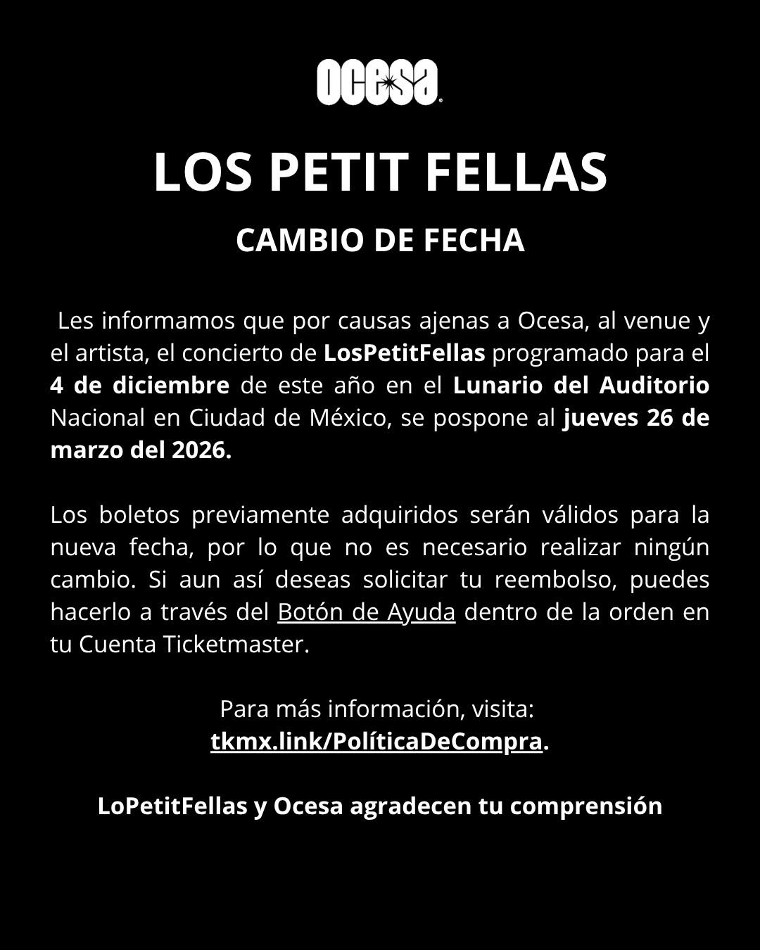 Para tranquilidad de los fans, los boletos adquiridos previamente seguirán siendo válidos para la nueva fecha, sin necesidad de realizar cambios adicionales. No obstante, se recomienda mantenerse atentos a los canales oficiales del evento y de la agrupación para conocer cualquier información complementaria.