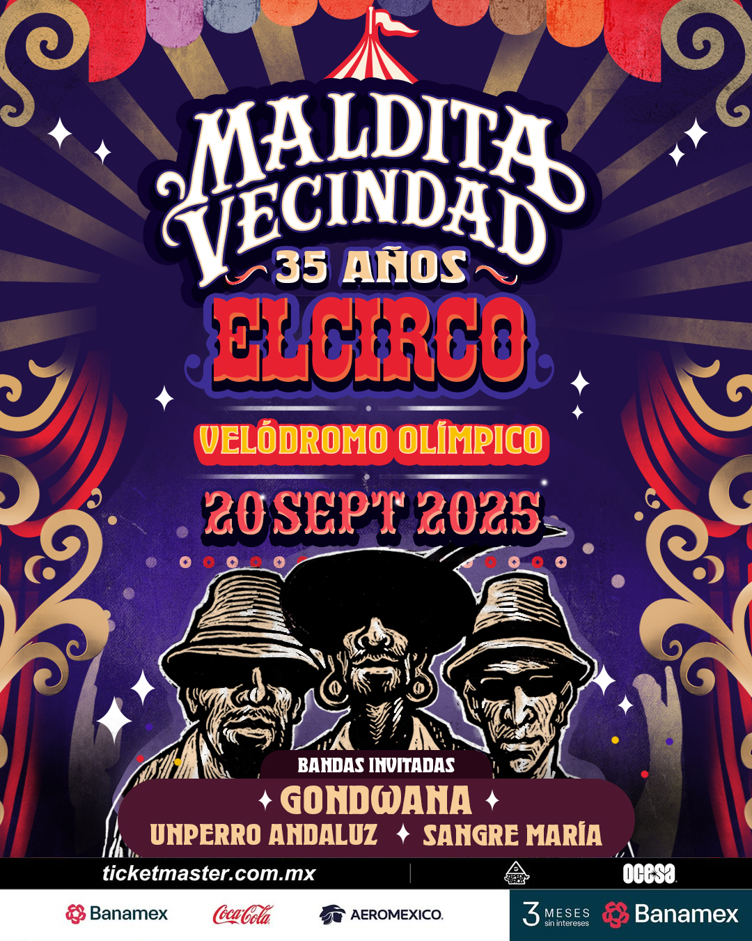 Maldita vecindad estrá festejando 35 años del disco más importante en su carrera, El Circo, y en su visión siempre colevtica ha decidido invitar a dos importates agrupaciones incipeiuntyes del rock nacional UNPERRO ANDALUZ y SANGRE MARÍA.