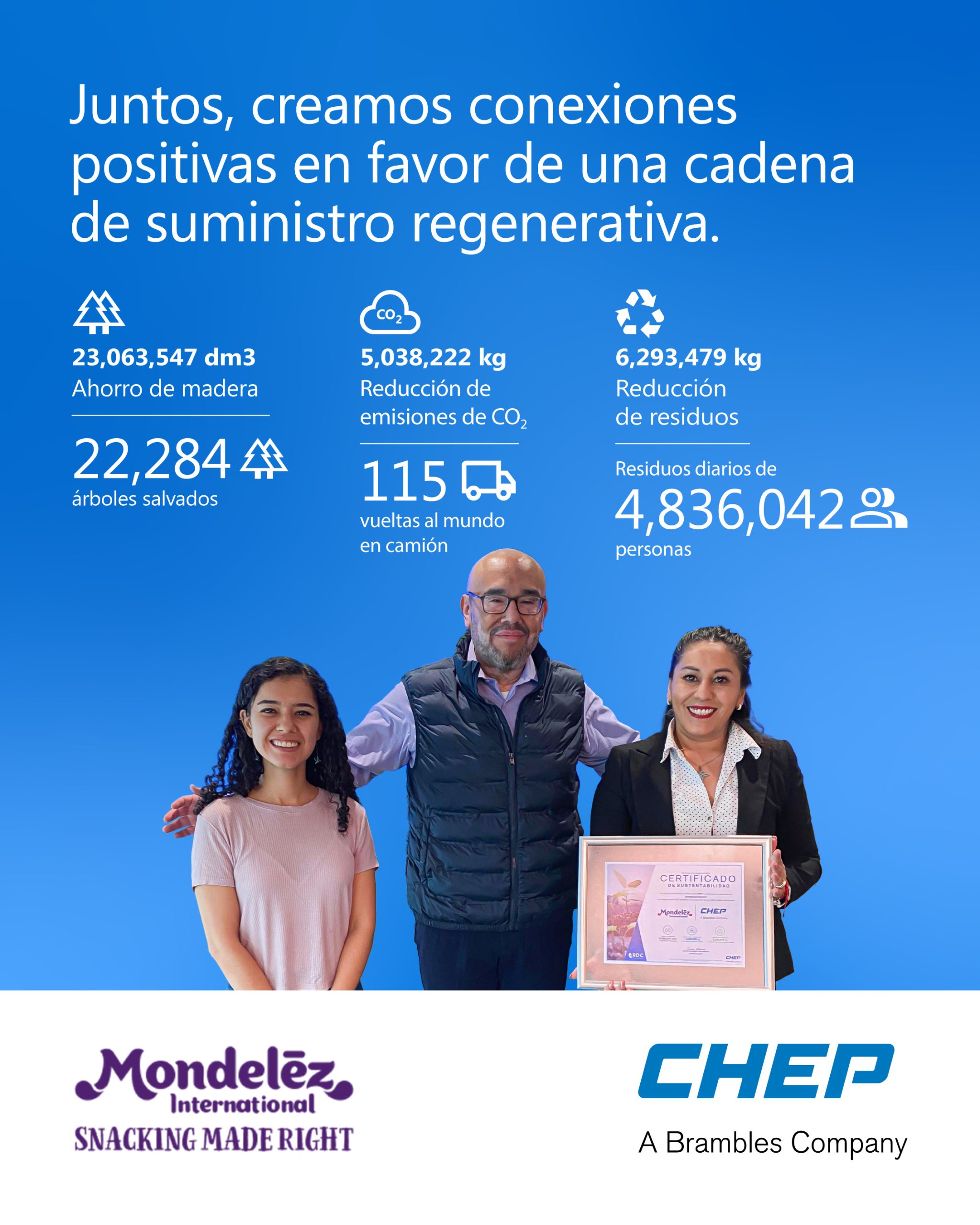 Gracias a esta alianza, CHEP entregó recientemente a Mondelēz México su Certificado de Sostenibilidad, un reflejo de los esfuerzos de circularidad que la compañía realiza a nivel global en toda su cadena de producción.
