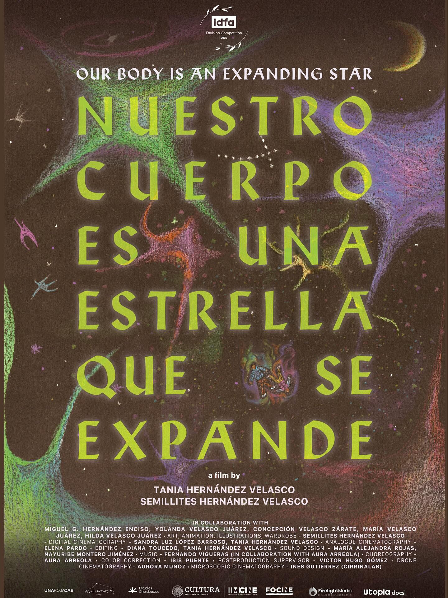 El lunes 17 de noviembre se celebró el estreno, en el marco del IDFA (International Documentary Festival Amsterdam) de la película mexicana Nuestro cuerpo es una estrella que se expande, co-dirigida por Tania Hernández Velasco y Semillites Hernández Velasco, dentro de la Sección Oficial competitiva Envision, una sección que presenta doce “películas de estilo inigualable e impactante, en la que cineastas visionarios forjan nuevos lenguajes”. El cine Pathé recibió a ambos co-directores, quienes presentaron la película en una sala llena que reaccionó con entusiasmo al filme.