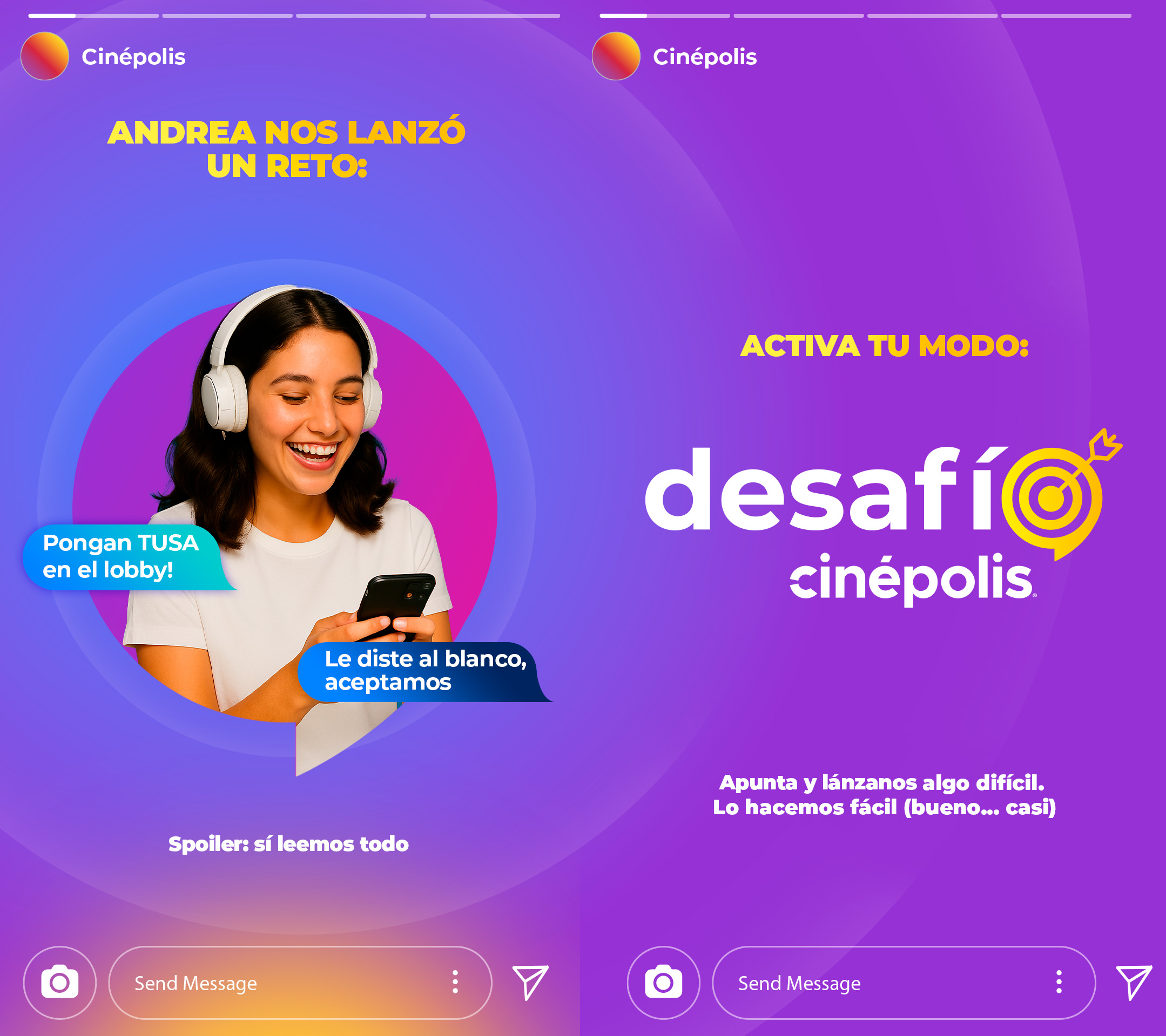 - Puedes retarnos en cualquiera de nuestras redes sociales, dejando tu propuesta en los comentarios con el hashtag #DesafíoCinépolis.